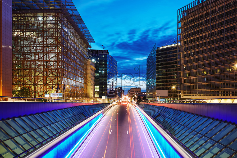 Long exposure shot of a central street at blue hour. Skyscrapers on background. Brussels, Belgium Royalty Free Stock photo