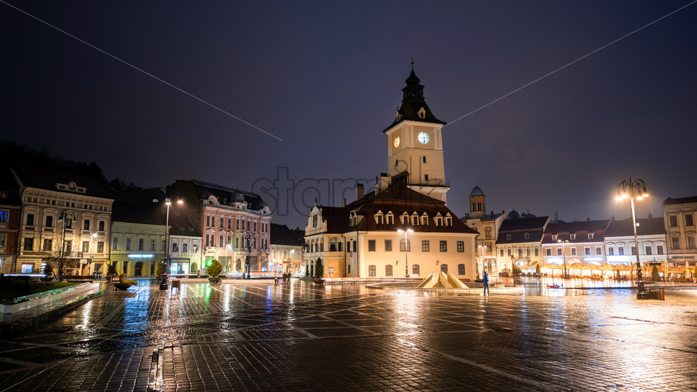 Long exposure shot of The Council Square in Brasov at night, Romania. Old city centre, classic buildings, nightlights