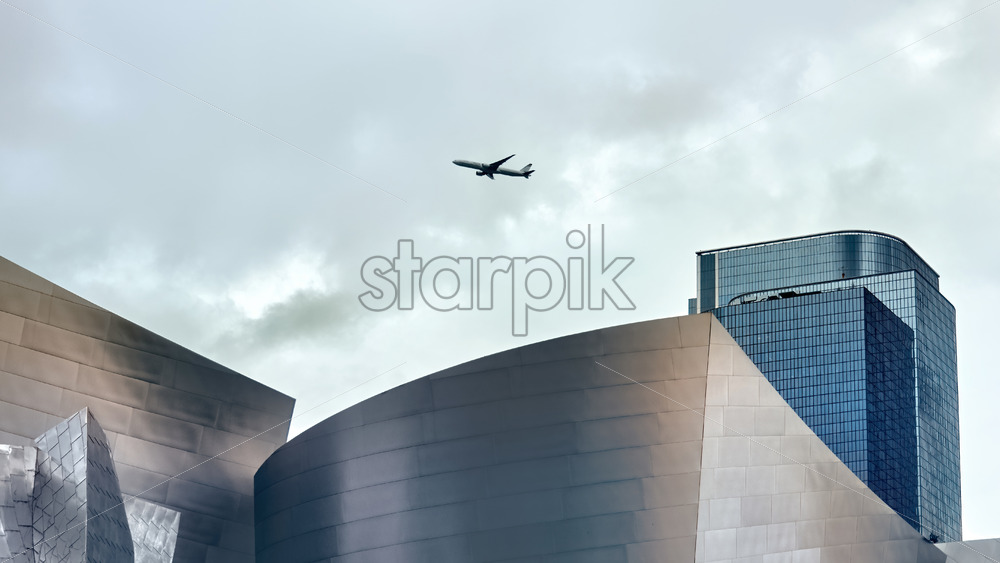 LOS ANGELES, USA – SEPTEMBER 26, 2019: High and modern buildings in downtown, flying plane in the distance
