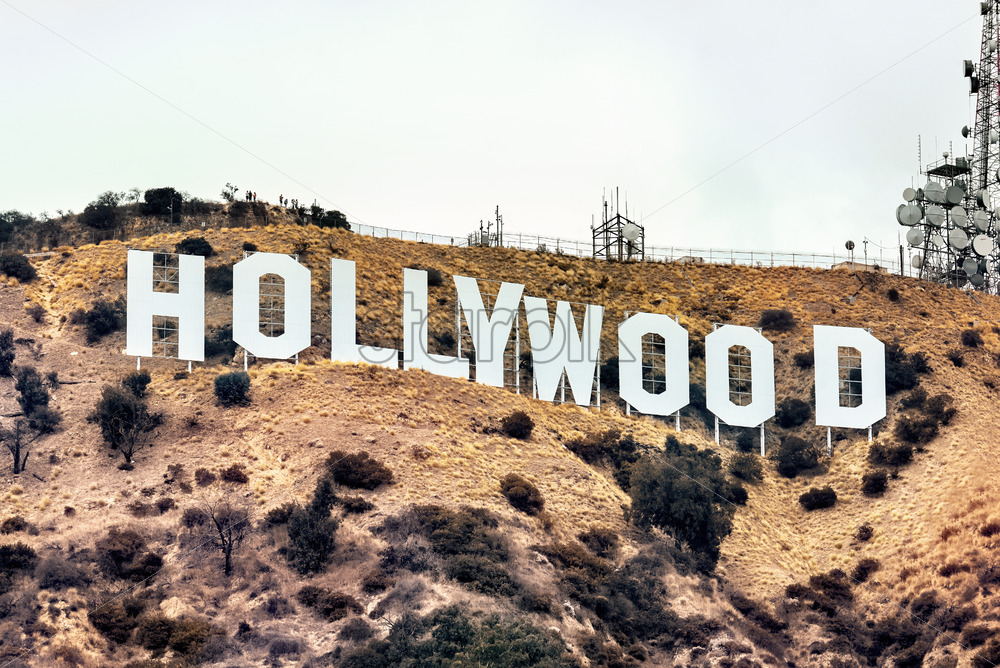 LOS ANGELES, USA – SEPTEMBER 26, 2019: Hollywood sign with communications facility on the hill