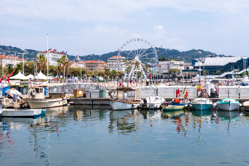 Lots of boats in the sea port of Cannes. Fishing in France. A few clouds in the sky