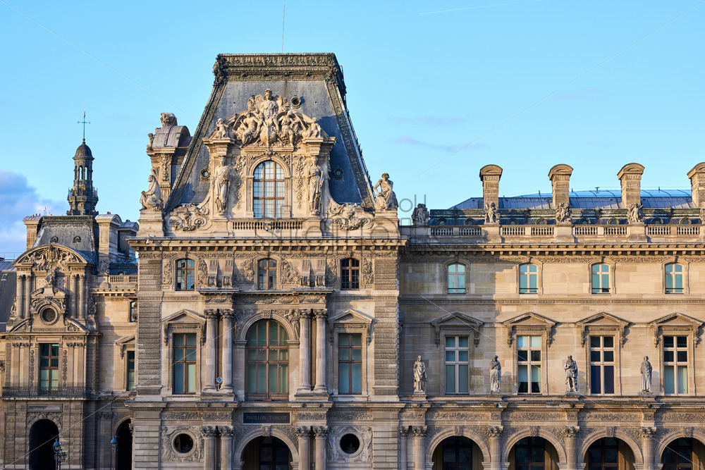 PARIS FRANCE – OCTOBER 3, 2018: The Museum of Louvre during the sunset of the day. The building is reflecting on the surface of a pyramid. Close up shot
