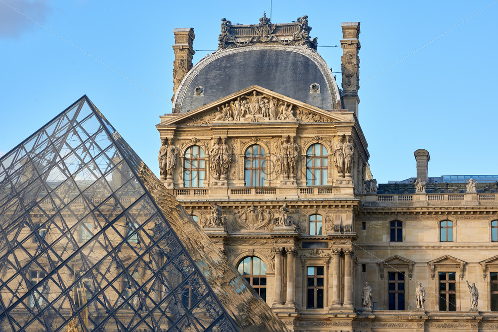 Louvre Museum facade at sunset. Pyramid on foreground. Paris, France