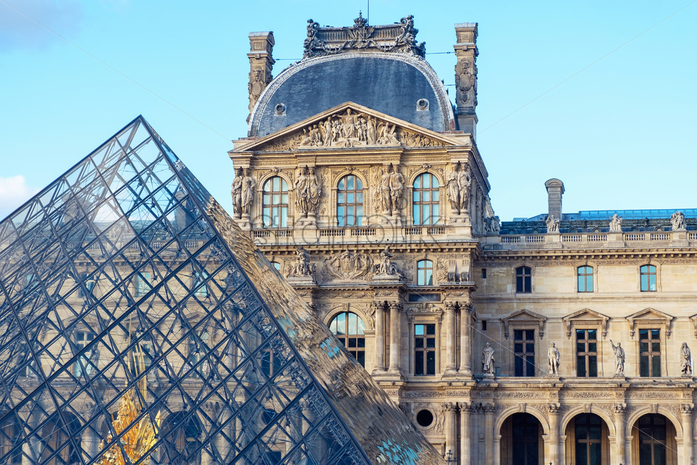 Louvre museum in orange and teal. Close up shot to a touristic atraction in Paris, France. No refelctions on the pyramid. Blueish tone on the building