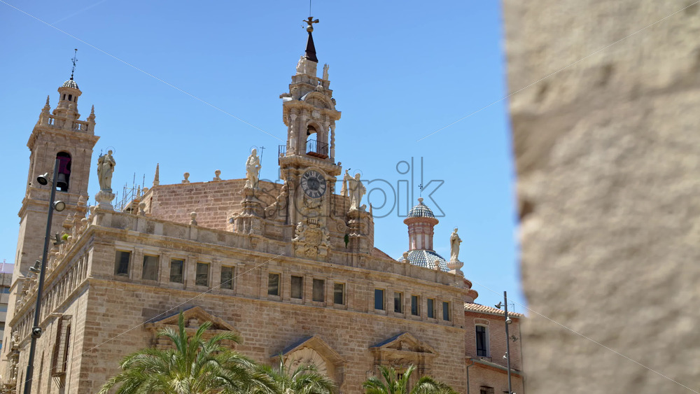 Low angle view of the baroque church Sant Joan del Mercat with statues, central clock and belfry, and blue-tiled domes against a bright blue sky in Valencia, Spain Royalty Free Stock Video Footage