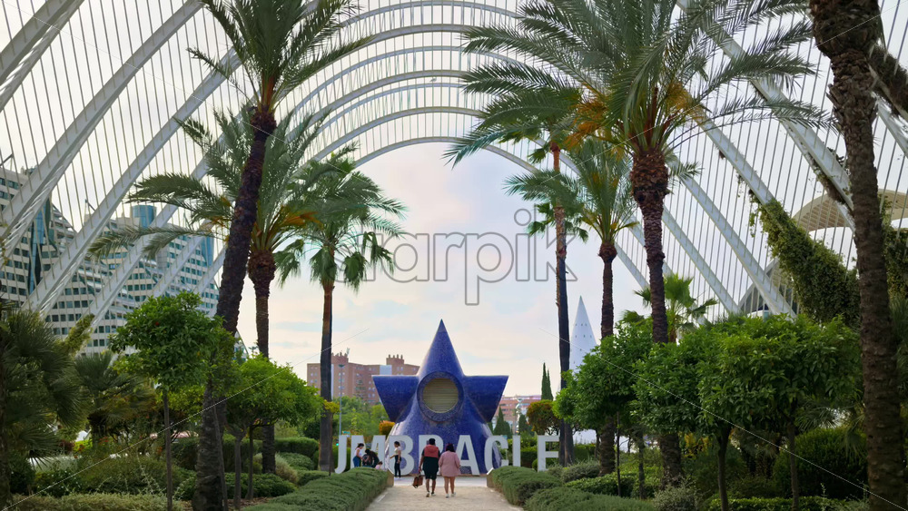 Valencia, Spain – May 28, 2025: White Palau de les Arts letters floating on the pool with the building’s sweeping forms behind Royalty Free Stock Video Footage