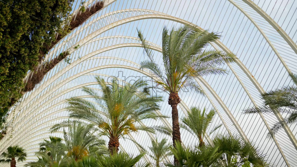 Low angle view through palm fronds to the repeating white arches of the L’Umbracle canopy in the City of Arts and Sciences, Valencia, Spain Royalty Free Stock Video Footage
