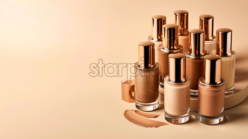 Brown glass bottles with gold lid, standing on table with tropical leaf