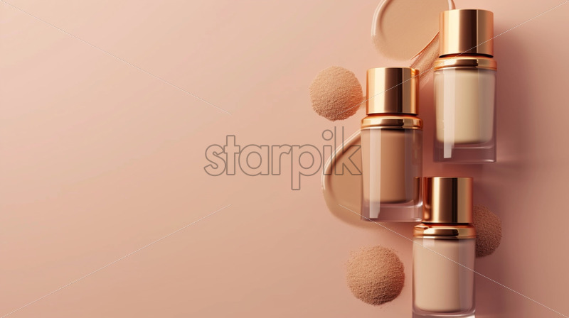 Brown glass bottles with gold lid, standing on table with tropical leaf