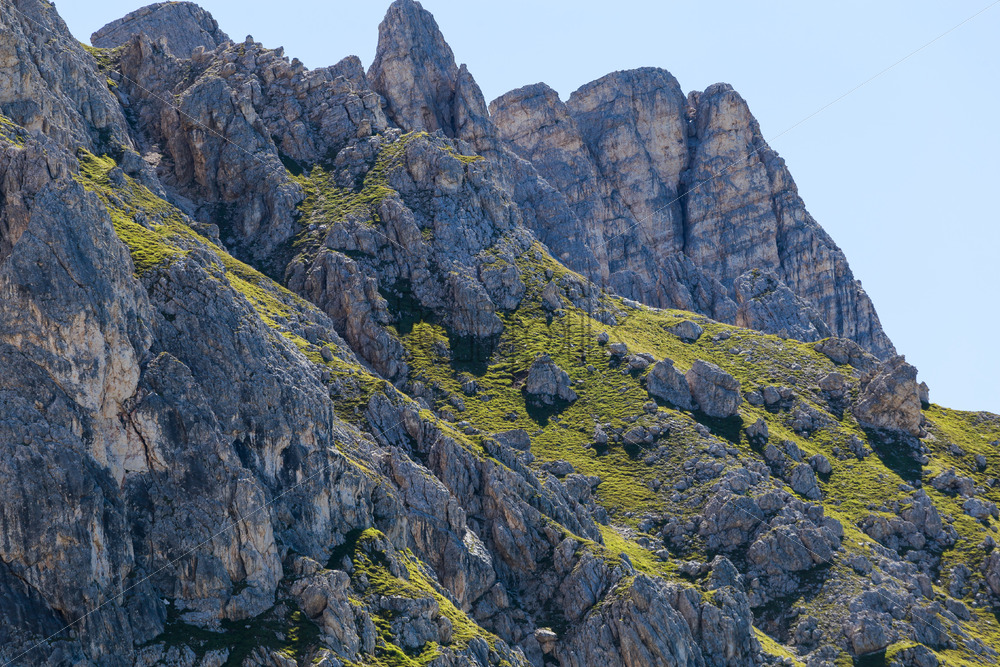 Magical dolomites mountains with rocks and green grass in Italy