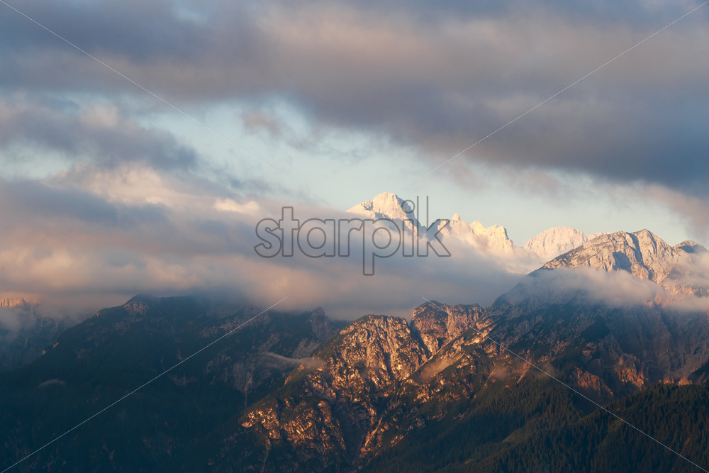 Magical dolomites mountains with white sunlight in Italy, green forest
