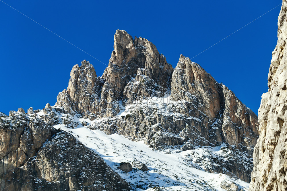 Magical dolomites mountains with houses and white sunlight with snow in Italy