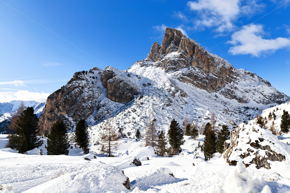 Magical dolomites mountains with white sunlight in Italy, forest and snow