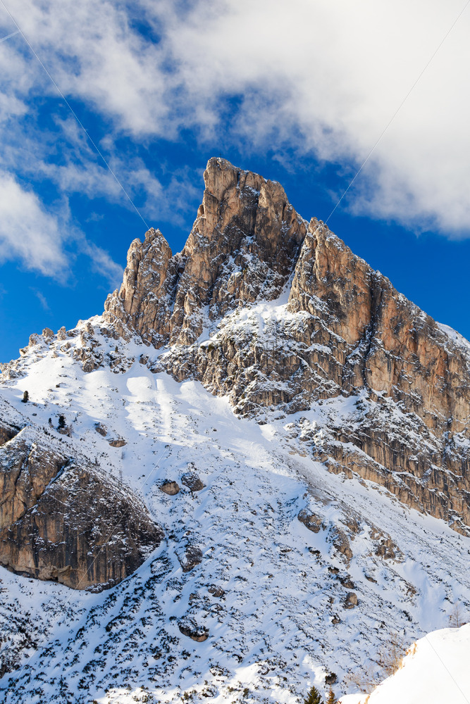Magical dolomites mountains with snow and white clouds in Italy