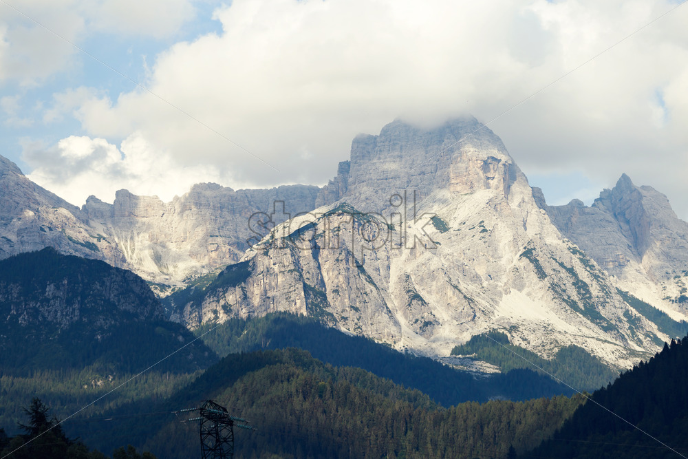 Home » Shop » photo » Magical dolomites mountains with white sunlight in Italy, clouds and forest