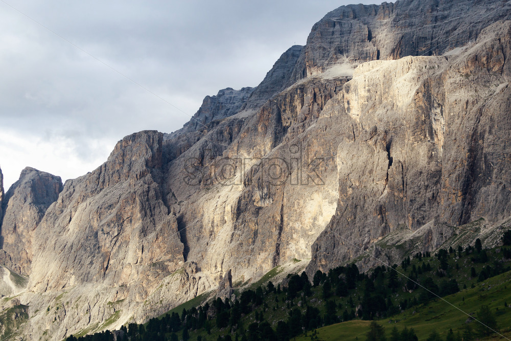 Magical dolomites mountains with white sunlight in Italy, green forest