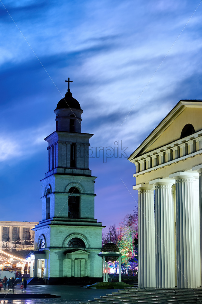 Aerial drone view of the Bell tower of the Metropolitan Cathedral of Christ’s Nativity. City center covered in snow at sunset in Chisinau, Moldova Royalty Free Stock Video Footage