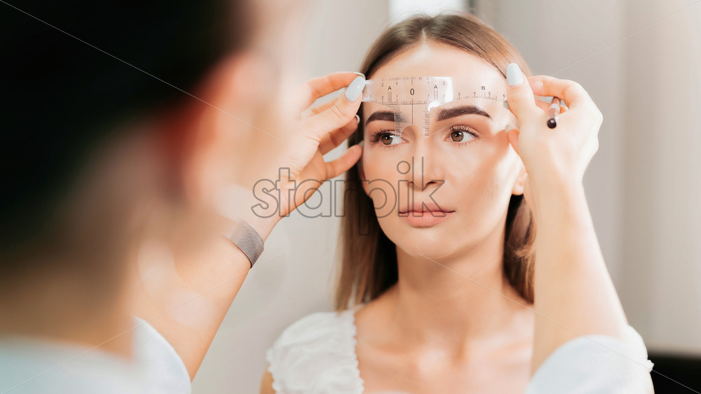 Make-up master checks client’s eyebrows using an eyebrow ruler