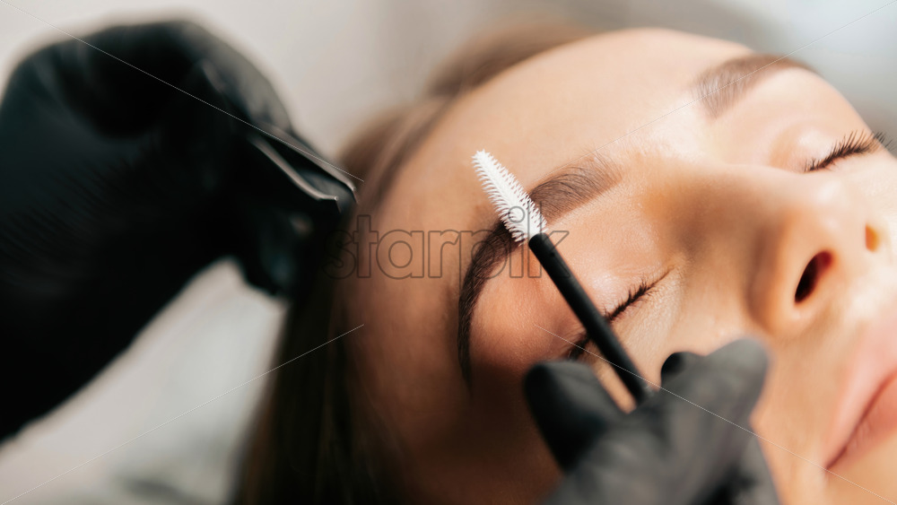 Make-up master does makeup for a client. Eyebrow painting