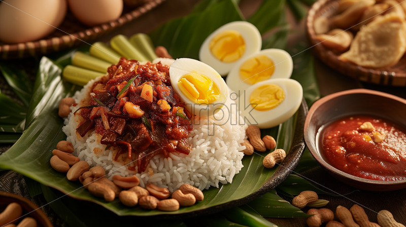 A tempting photograph featuring Malaysian Nasi Lemak, a fragrant coconut rice dish with anchovies, peanuts, boiled eggs, and sambal.