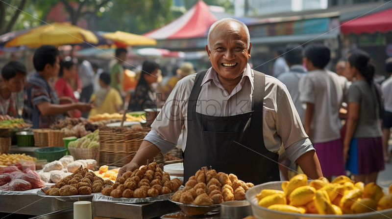 Home » Shop » Uncategorised » Male Thai’s Vendor in front of his merchandise in the street of Bangkok looks happy of his product