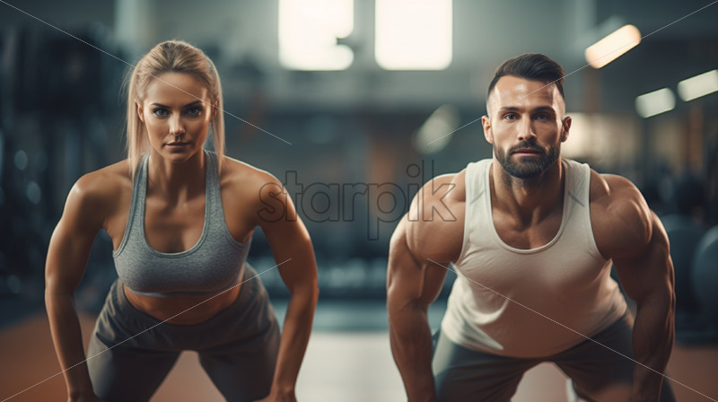 shared workout session in a trendy home gym, with the couple encouraging each other