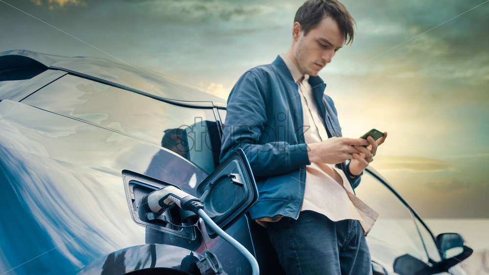 A young man using smartphone at a car charging station with charging electric car nearby. Chisinau at sunset, Moldova. Slow motion Download royalty free stock video footage Royalty Free Stock Video Footage