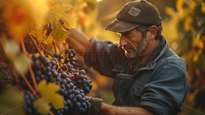 A hardworking farmworker in the sunlit vineyards of Napa Valley, California, as he harvests grapes