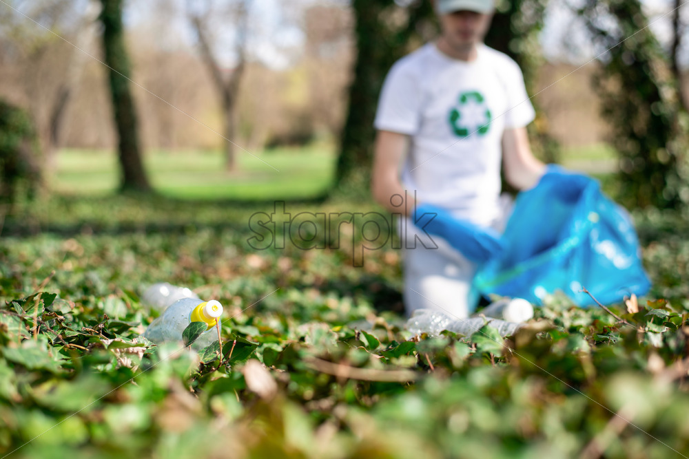 Man collecting plastic garbage in bag in a polluted park. Rubber gloves, recycling sign on T-shirt