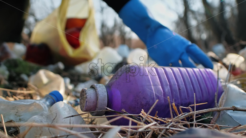 Boy and girl collecting plastic garbage in a container in a polluted clearing, recycling signs on the T-shirts. Slow motion Royalty Free Stock Video Footage