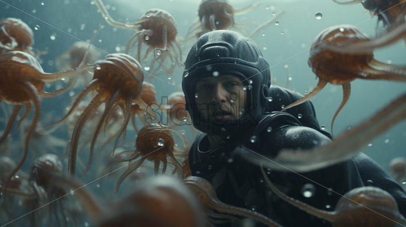 Home » Shop » Uncategorised » Man dressed in a diving suit swimming among jellyfish
