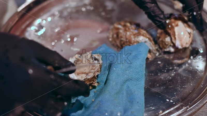 Video – Man hands cleaning and opening oysters with special knife at seafood restaurant, slow motion