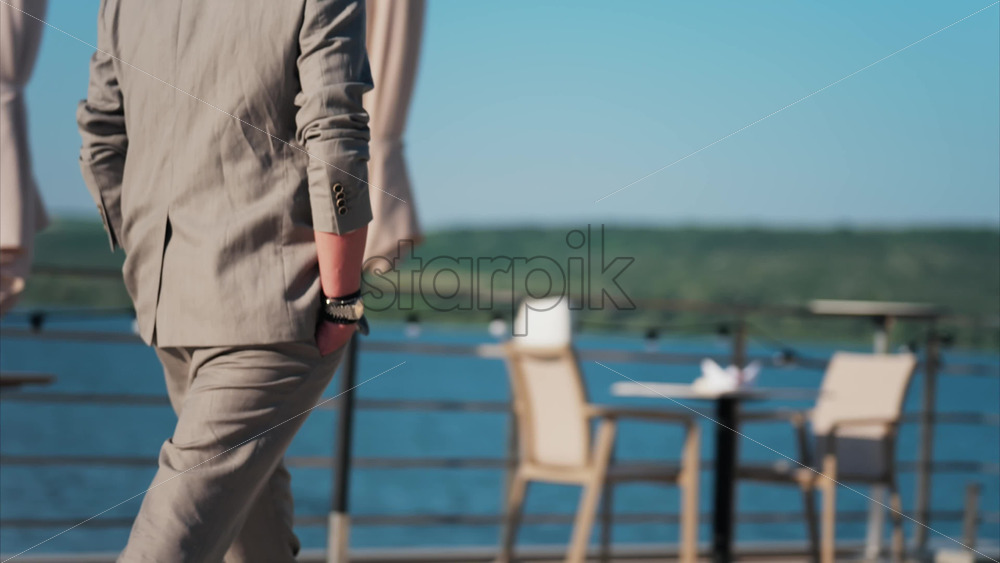 Woman in a white dress, holding a wide hat with a ribbon walking on a scenic terrace with a view of a calm body of water Royalty Free Stock Video Footage