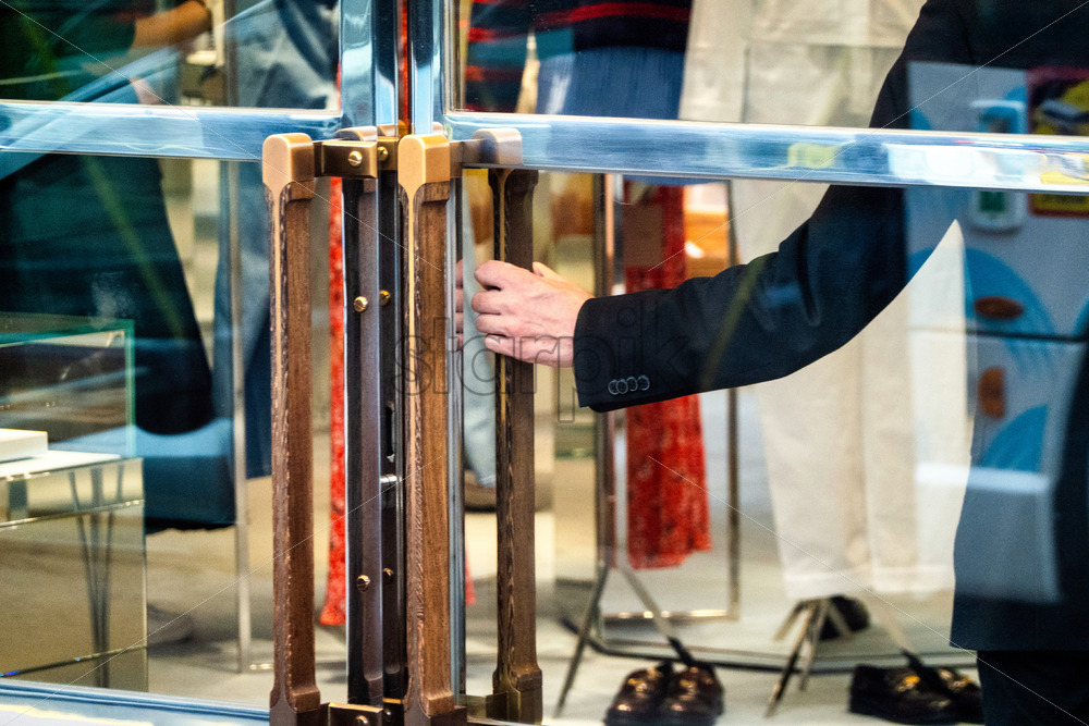Man in black suite holding hand on shopping glass door in Cannes, France