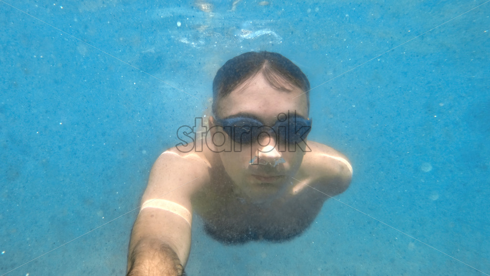 Man in goggles swimming under the blue and transparent water of the Mediterranean sea. Holding the camera