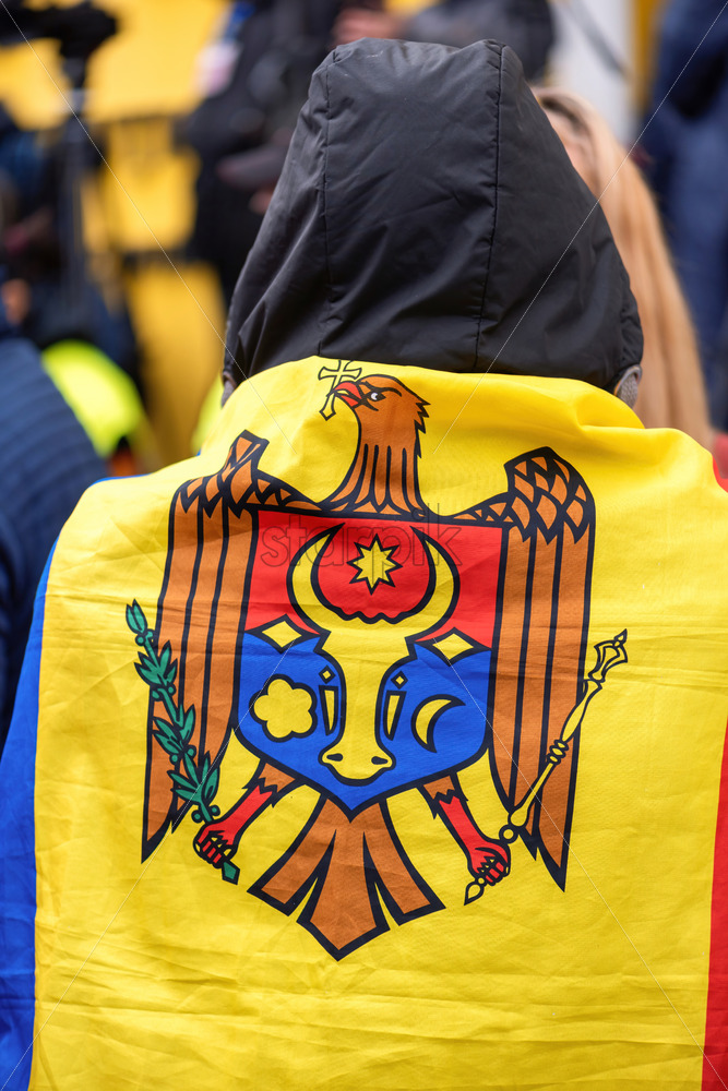 Man in national flag and people protesting for snap elections in front of constitutional court building