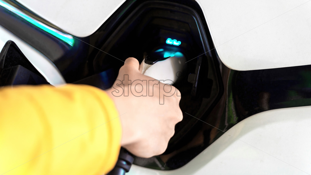 Home » Shop » photo » Man plugging in charger into an white electric car