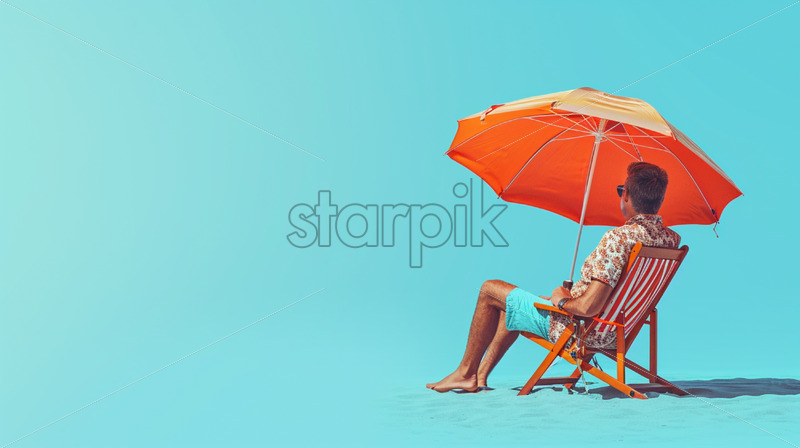 Home » Shop » Uncategorised » Man sitting on deck chair with beach umbrella, on isolate blue background