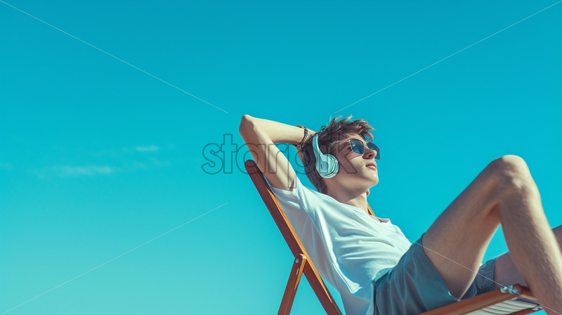 Man sitting on deck chair with beach umbrella, on isolate blue background