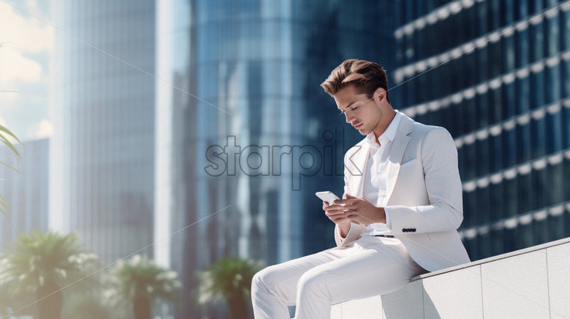 Home » Shop » Uncategorised » Man texting on a phone wearing white suite, modern business center