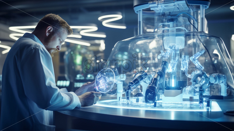 Group of teens doing experiments in robotics in a laboratory. Boys and girls in protective and VR glasses working with a robot. Red and blue illumination