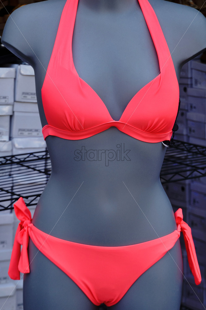 Mannequin with female red swim suite in the street