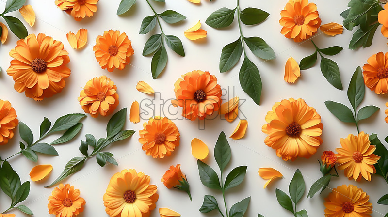 Marigold leaves and flowers on a white background