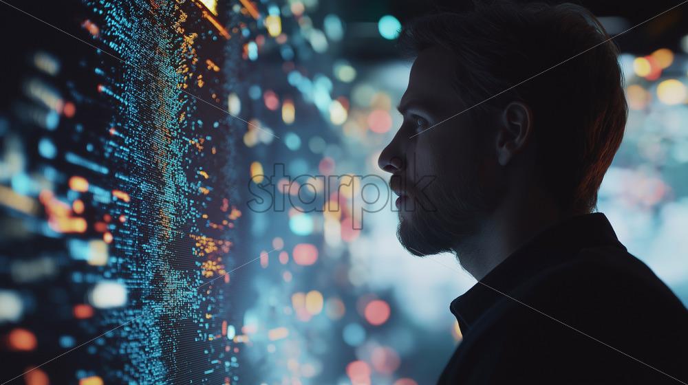 marketing expert surrounded by floating data visualizations and infographics, analyzing