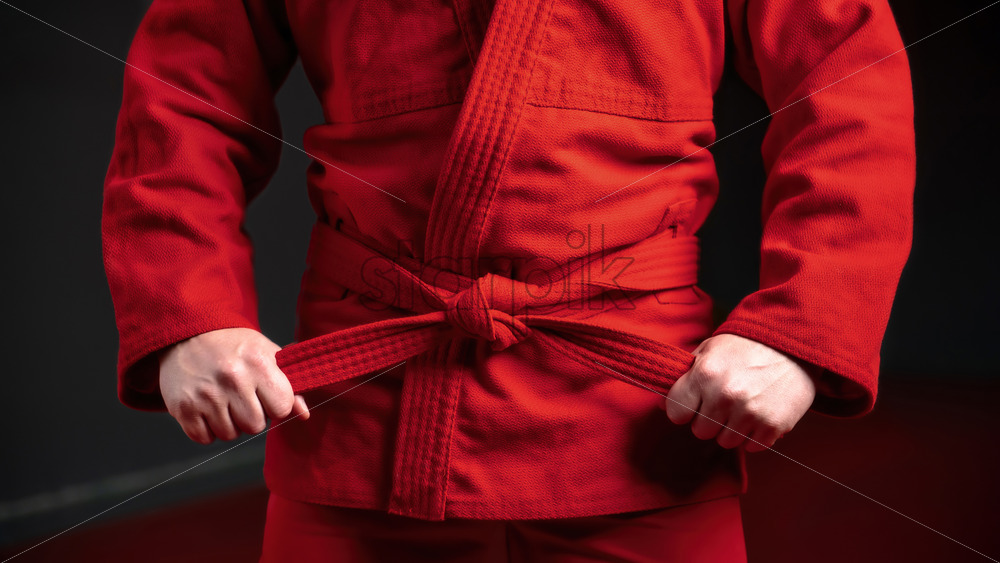 Martial arts fighter in red kimono posing and holding his belt