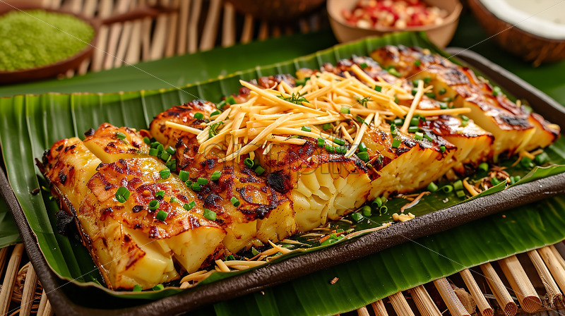 An inviting food photography of Filipino cuisine, Nilupak, featuring mashed cassava topped with cheese, elegantly presented on banana leaves and a wooden serving plate, embodying the essence of native style in a visually appealing composition.