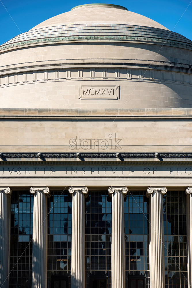 Massachusetts Institute of Technology entrance front side facade and dome in Boston, USA