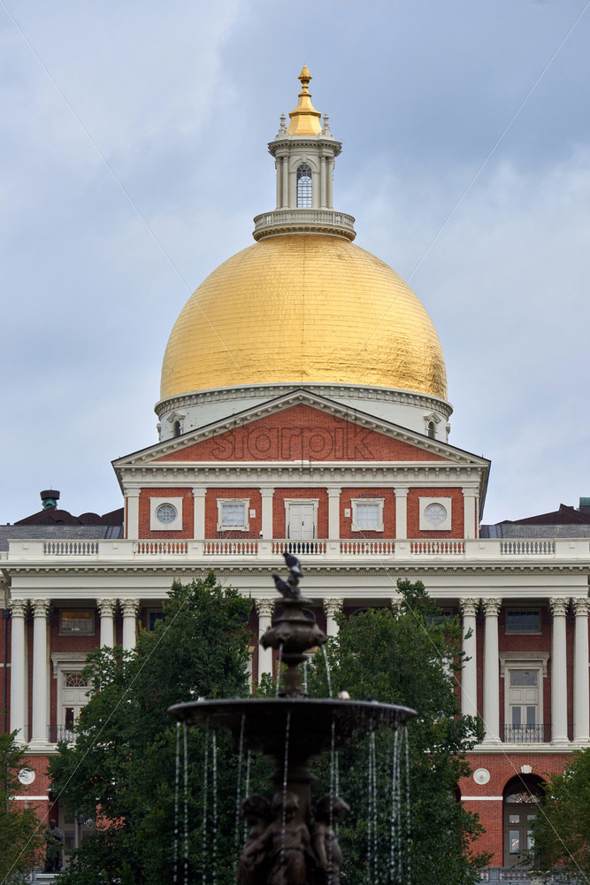 Massachusetts State House with a fountain in front of it. The color of the sky is dominated by gray shades, the sky is cloudy . Royalty Free Stock photo