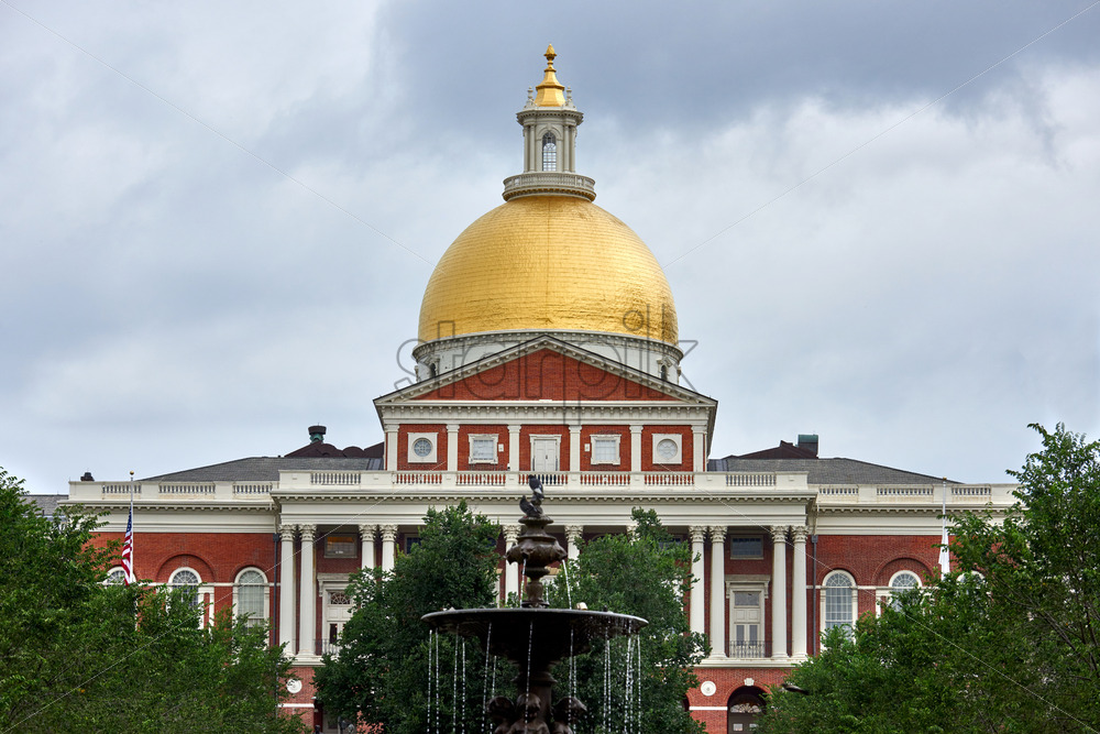 Massachusetts State House with a fountain in front of it. The color of the sky is dominated by gray shades, the weather is cloudy . Royalty Free Stock photo
