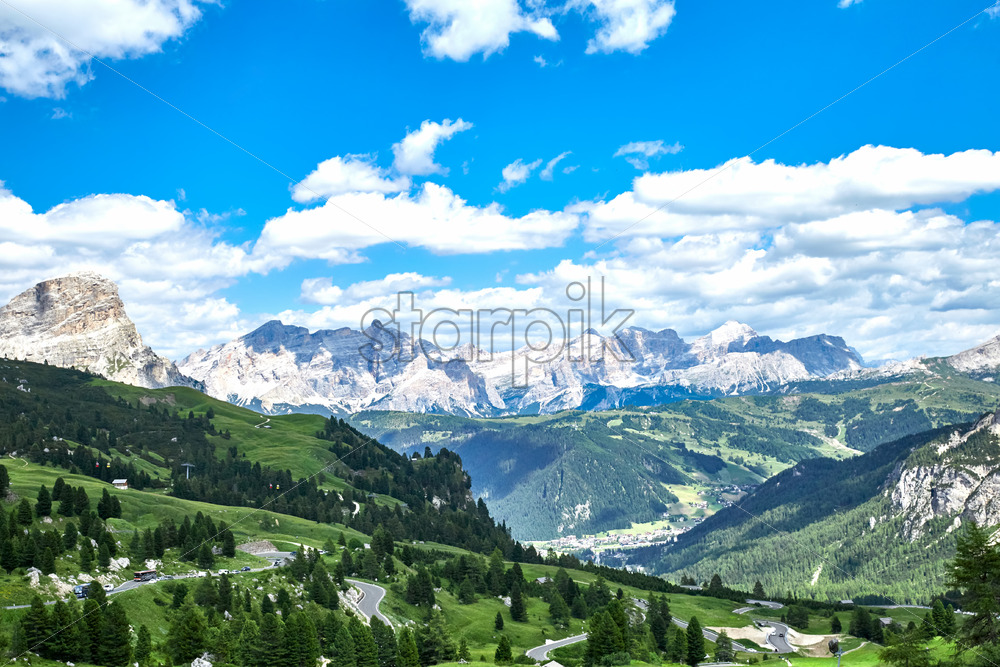 Meadow fields and white mountains. Serpentine road. Dolomites, Italy